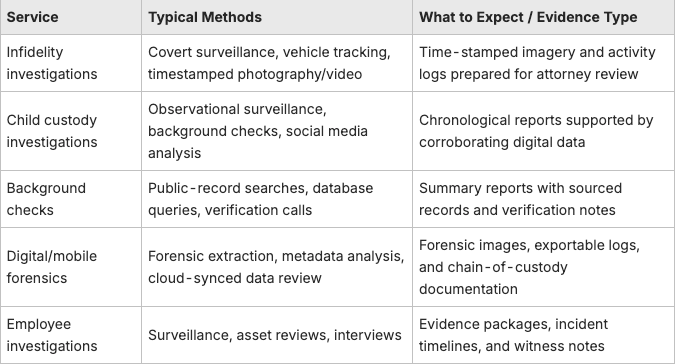 - Core services commonly include infidelity investigations, child custody support, civil matters, and background checks.