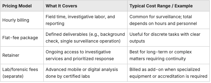 Client experience typically follows a predictable path: initial consultation, scope definition, engagement via retainer or hourly arrangement, active investigation, and delivery of evidence and reports. Providers vary in communication cadence and billing transparency. Common pricing models include hourly billing, flat-fee packages for defined tasks, and retainers for ongoing work—each covering different scopes and administrative overhead. The table below explains typical pricing models, what they cover, and realistic expectations without assigning firm-specific rates. Use it to interpret proposals and choose the model that fits your case complexity.